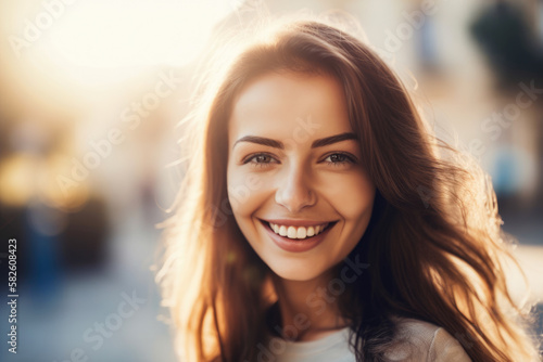 Cheerful and friendly portrait of a woman with a bright smile and an outgoing personality, radiating positive energy, generative ai