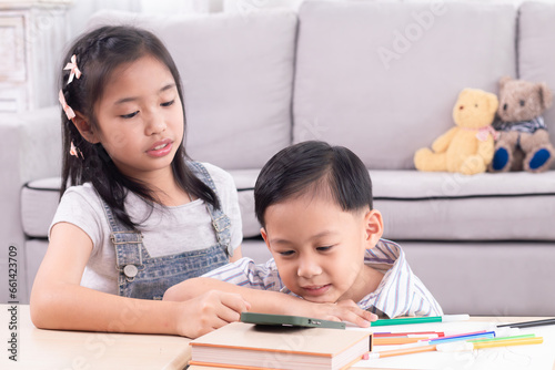 Cheerful Asian mother or teacher spend time with two siblings kids home school learning and practicing together in living room at home, free time children bonding relationship with mom parenthood