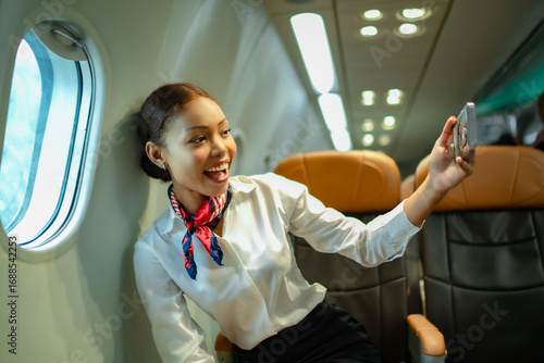 Cheerful Asian stewardess smiling brightly while taking selfie by airplane window. Aviation service, inflight happiness, cabin crew lifestyle, and airline hospitality concept.