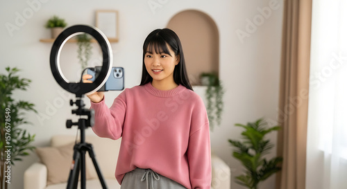 Cheerful Asian woman live streaming for her vlog, using a smartphone and ring light in her modern home studio.