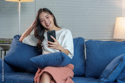 Cheerful Asian woman using mobile phone Chat on the website, application, download, work or study online. Sit on the sofa and relax. modern technology concept
