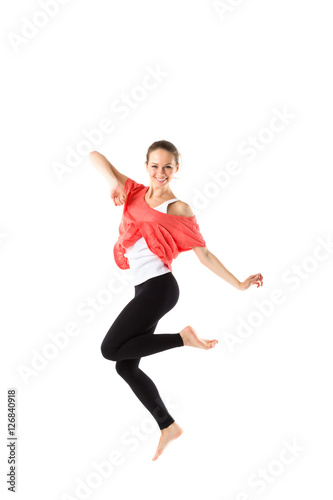 Cheerful, athletic girl jumping and looking into the camera. Isolated.