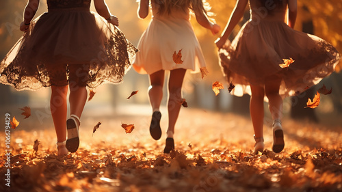 cheerful bachelorette party in an autumn park in leaf fall, girl in a light skirt against the background of autumn falling leaves and friends vacation in autumn