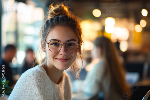 Cheerful beautiful young freelance woman working on laptop in cafe, smiling, bokeh blurry background.