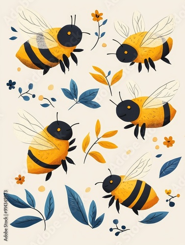 Cheerful Bees Flying Among Yellow and Blue Floral Motifs