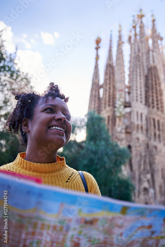 Cheerful black tourist woman holding a map and looking at view in sagrada familia, enjoying her travel adventure. Vertical image with copy space.