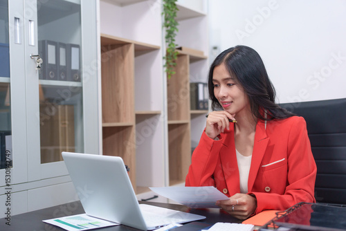 Cheerful business lady working on laptop in office, Asian happy beautiful businesswoman in formal suit work in workplace. Attractive female employee office worker smile.