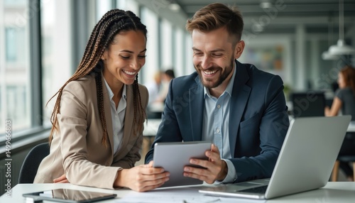 Cheerful business people browsing corporate website. Male female employees discuss application on netbook. Wireless communication, online booking, banking, search. Workspace interior, modern tech,