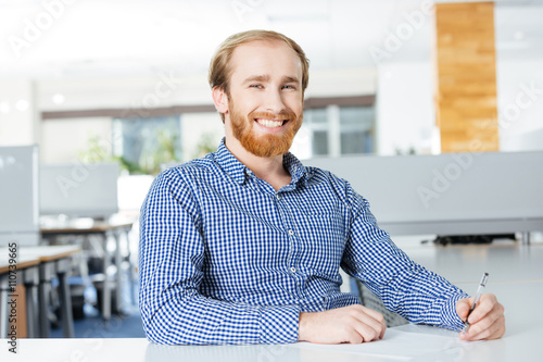 Cheerful businessman sitting at the table and writing
