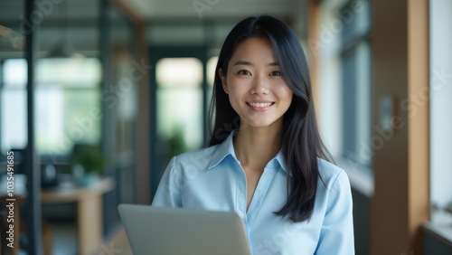 Cheerful Businesswoman Smiling with Tablet in Bright Office Environment
