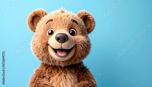 Cheerful cartoon bear character with a friendly smile against a light blue background