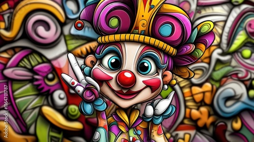 Cheerful cartoon clown with vibrant, colorful graffiti background making peace sign.