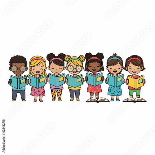 Cheerful Cartoon Diverse Group Children Reading Book Education Illustration