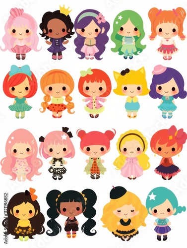 Cheerful Cartoon Girl Stickers: A Diverse Hair and Costume Collection