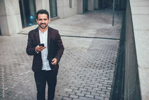 Cheerful caucasian bearded male in stylish wear using mobile phone while strolling on urban setting typing messages, portrait of prosperous businessman holding mobile phone walking in downtown.