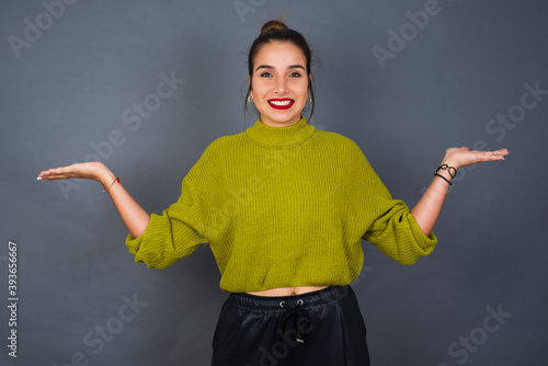 Cheerful cheery optimistic Young beautiful hispanic woman wearing green sweater against gray background holding two palms copy space