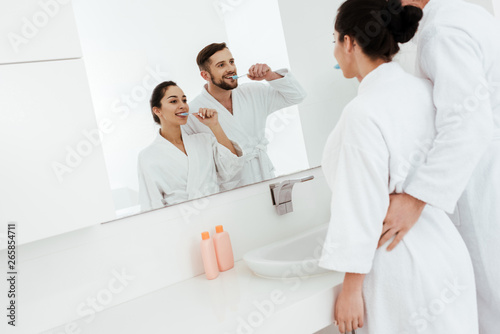 cheerful couple looking at mirror and brushing teeth while standing in bathrobes