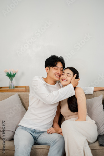 Cheerful couple sharing a warm embrace, smiling and enjoying each other's company on a comfortable couch at home.