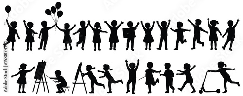 Cheerful crowd of children. Silhouettes of saluting, applauding, thumb up. Happy boys and girls in full grow Vector art of a silhouette of children playing and celebrating isolated.