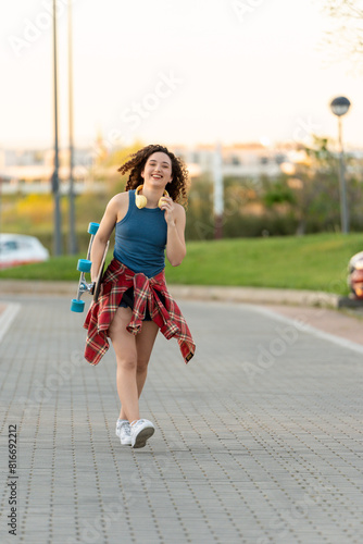 Cheerful curly-haired woman carrying a skateboard and wearing headphones, strolling in a park, with a blue tank top and plaid shirt at sunset.
