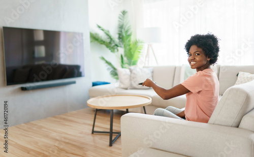 Cheerful cute woman sitting on sofa in bright living room changing tv channel