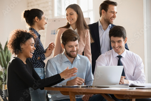 Cheerful diverse coworkers enjoying teamwork success, successful cooperation, good job, meeting at workplace with laptop, celebrating good sales results, talking, laughing