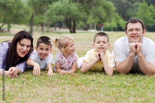 Cheerful family of five lying on lawn in the green park