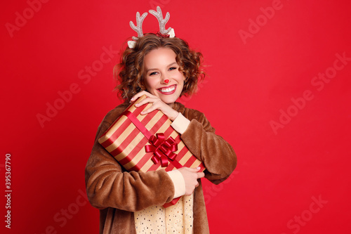 Cheerful female showing Christmas gift