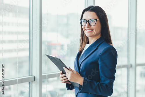 Cheerful female standing near window in her new office, expressing pleasant emotions and confidence.