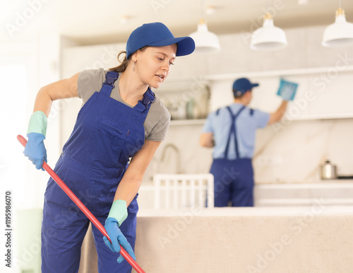 Cheerful girl from cleaning service washes floor in customer's house. High quality photo