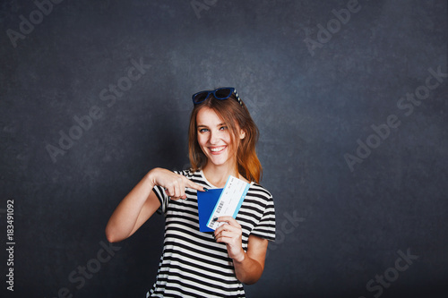 Cheerful girl holding passport, plane ticket and globe before grey background, indoor travel concept