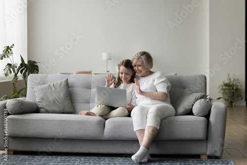 Cheerful granny and grandchild talking on video call, using laptop on couch together, waving hand at screen, enjoying domestic Internet communication, smiling, laughing