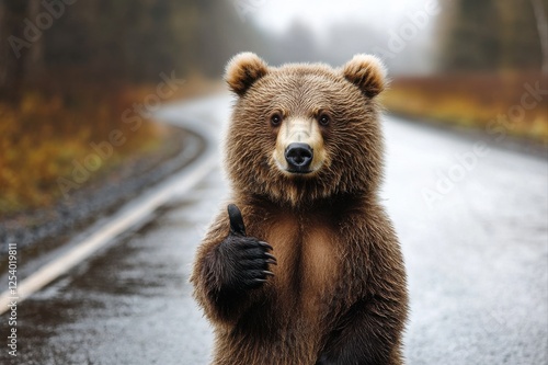 Cheerful grizzly bear giving thumbs up forest road wildlife photography early morning close-up positive vibes