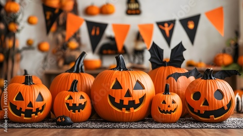 Cheerful Halloween pumpkin display with playful costumes and vibrant for a fun kids holiday Festive table setting with carved jack o lanterns banners and other seasonal elements