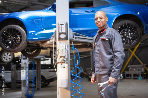 Cheerful handsome African male mechanic smiling to the camera confidently, working at car service