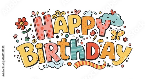Cheerful Happy Birthday Greeting with Flowers, Butterflies and Fun Elements