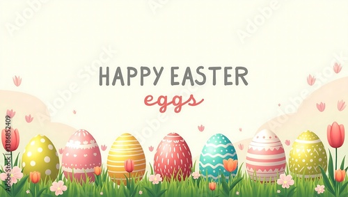 Cheerful Happy Easter Eggs Scene with Colorful Decorated Eggs, Tulips, Grass, and Floral Accents on Soft Yellow