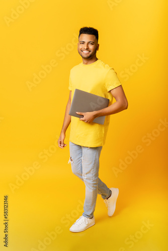 Cheerful Indian man carrying laptop computer isolated on yellow. Happy arab male student with laptop walking, freelancer using portative gadget, computer. Vertical photo