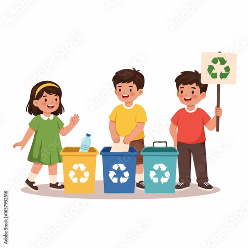 Cheerful kids in colorful clothes recycling waste into yellow, blue, and turquoise bins with recycling symbols.