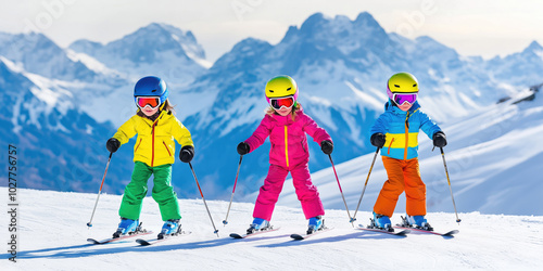 Cheerful little children in colorful ski costume practicing ski at mountain resort on a sunny winter day.