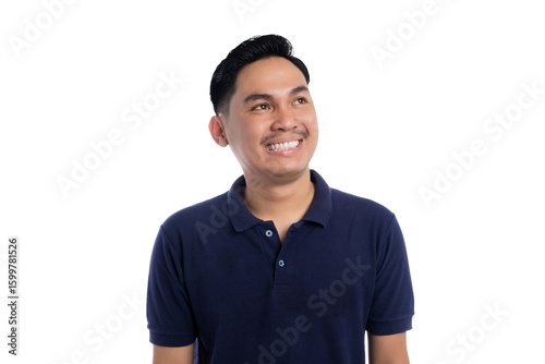 Cheerful man looking up with hopeful expression and smiling face isolated on transparent background