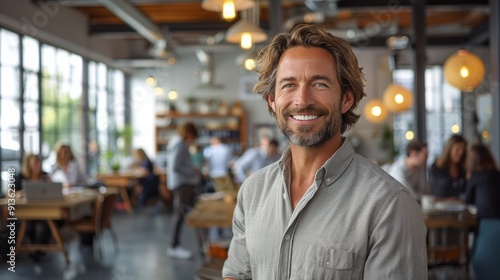 Cheerful Man Smiling in Modern Coffee Shop With Busy Customers Working During Daylight Hours