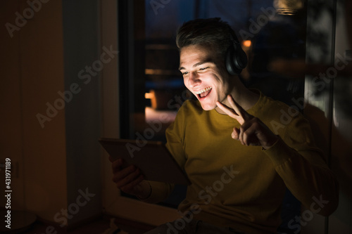 Cheerful man wearing headphones gesturing peace sign on video call while sitting in living room