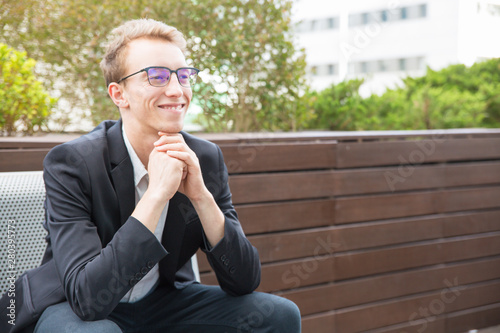 Cheerful manager enjoying work break outside. Happy young business man in eyeglasses and jacket sitting on bench, leaning chin on hands, looking away and smiling. Business portrait concept