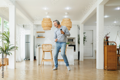 Cheerful Middle aged mature man in headphones with smartphone dancing in kitchen at home.