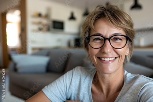 Cheerful middle-aged woman with glasses smiles warmly at the camera, capturing a moment of happiness in her cozy, well-lit living room with modern decor