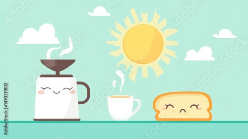Cheerful morning scene with coffee pot, cup, and bread under a bright sun and clouds