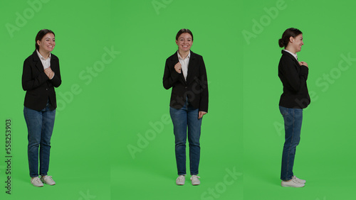 Cheerful office worker waving hello or goodbye on camera, doing greeting gesture over green screen backdrop. Young happy businesswoman saying hi in studio, wearing suit on full body greenscreen.