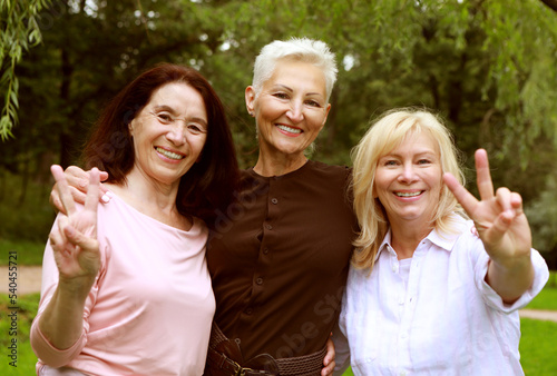 Cheerful old ladies have fun in summer park, look at camera and show victory sign. The concept of happy old age and friendship.