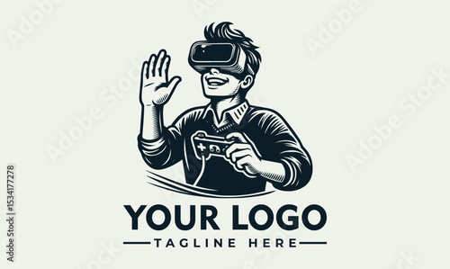 Cheerful person wearing a virtual reality headset and holding a game controller with abstract digital elements. Gaming and technology concept